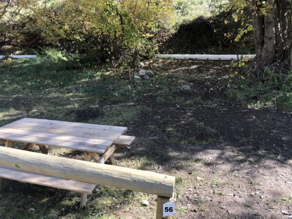 Campsite #56 – Sun arrives by 9am, with full shade on site and no shade in parking area by noon. Parking area can accommodate two large vehicles (20’Wx24’L). Parking area is shared with sites #54-58, and allows for two large vehicles each. Level but blocks are always suggested to help sleep in a vehicle. Will fit small to medium sized tent(s) on mostly level ground (20’Wx18’L). One of our smaller campsites for tents.