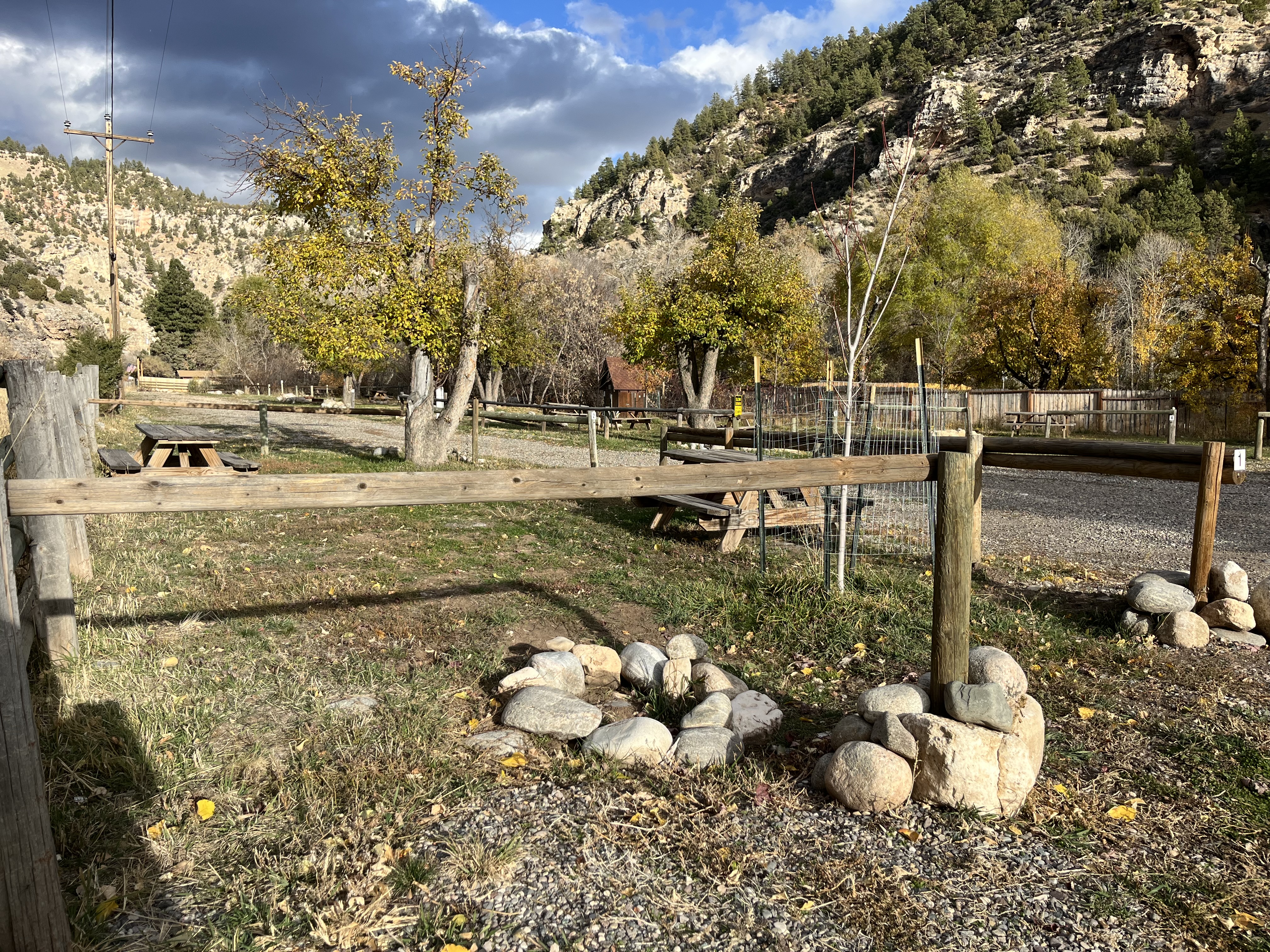 Amenities – Picnic table and shared camp fire ring. Roadside campsite near bathhouse.