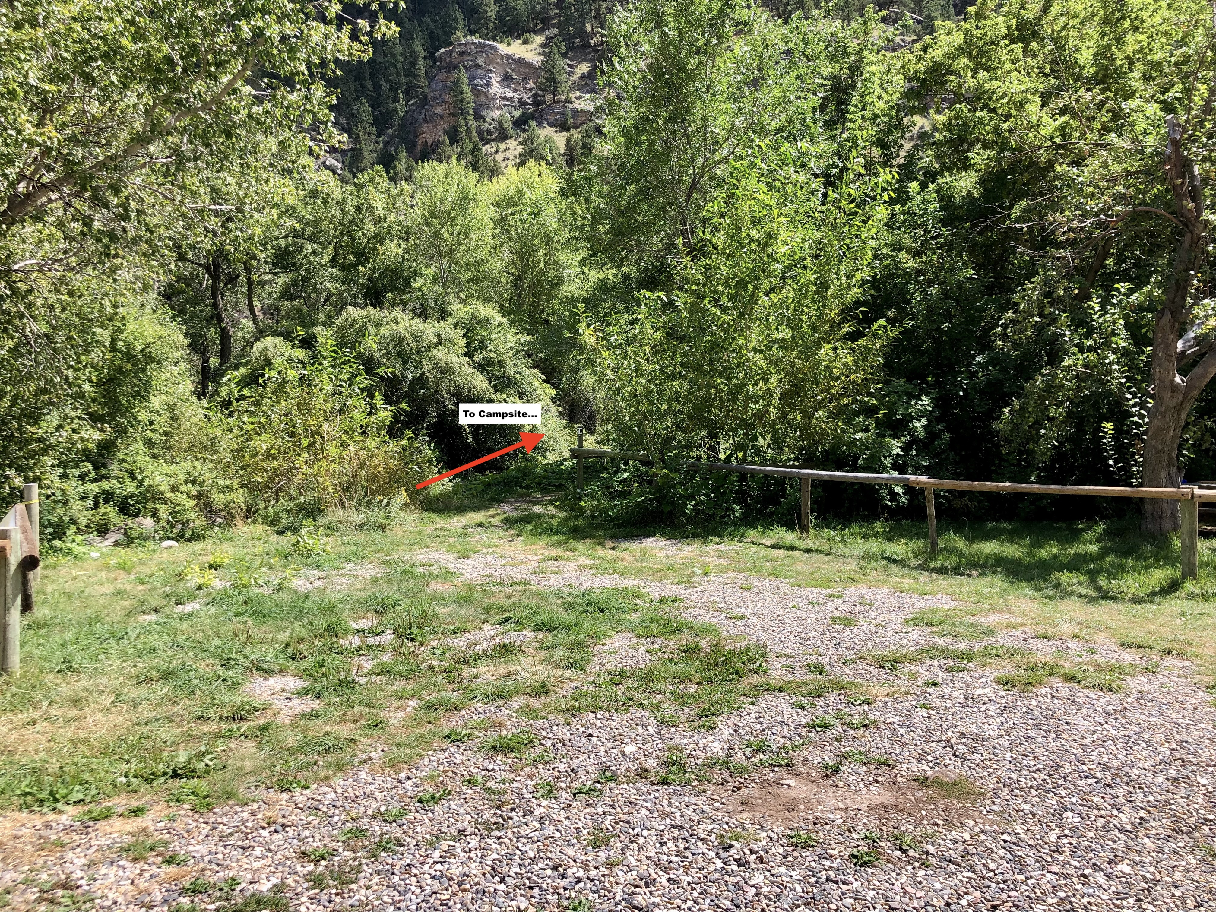 Campsite #10 – Sun arrives by 9am, partial shade on site and no shade in the parking area by noon. Full sun on fence line parking spot all day (8’Wx24’L). Parking area accommodates three small vehicles or two large vehicles (30’Wx24’L). Be mindful of the road width when parking along fence line. Mostly level but leveling blocks are always suggested for vehicle sleeping. There are several tent options as seen in photos (20’Wx15’L). Site is down a pathway to the right of the parking area.