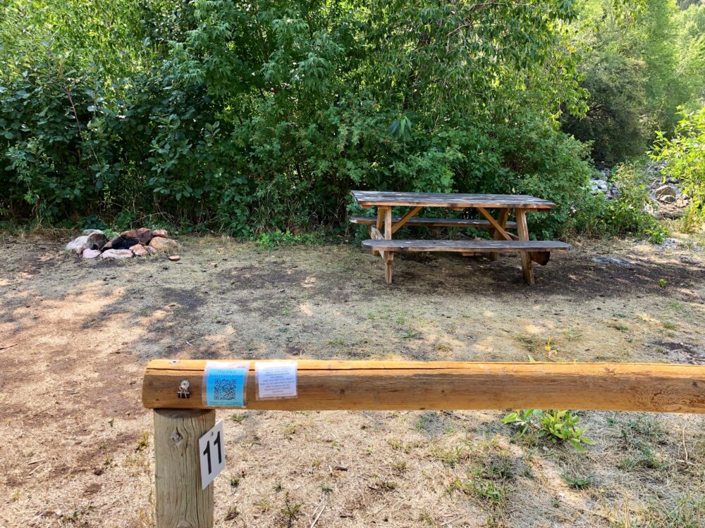 Campsite #11 – Sun arrives by 9am, no shade on site and no shade in the parking area by noon. Full sun on fence line parking spot all day (8’Wx24’L). Whole site is 36’Wx20’L, with 16’Wx20L dedicated to a fire ring and picnic table, and 20’Wx20’L for parking and/or tents. Parking area accommodates two large vehicles under 20′ in length each parked head-in, or a longer vehicle parked askew. Be mindful of the road width when parking along the fence line. Level but leveling blocks are always suggested for vehicle sleeping.