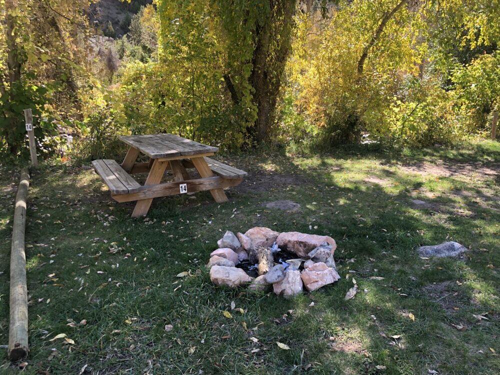 Campsite #14 – Sun arrives by 9am, full shade on site and main parking area all day. Full sun on fence line parking spot all day (8’Wx24’L). Whole site is 29’Wx20’L, with 18’Wx22’L area possible for parking, and 8’Wx22’L designated for table and campfire ring. Be mindful of the road width when parking along fence line. Level but leveling blocks are always suggested for vehicle sleeping.