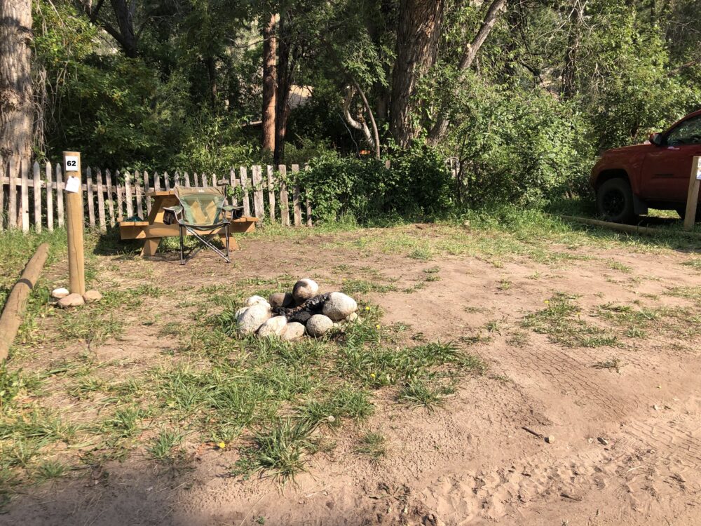 Campsite #62 – Sun arrives by 9am, with no shade on site and no shade in parking area by noon. Parking area can accommodate a large vehicle under 22′ in length (12’Wx22’L). Site is level but blocks are always suggested to help sleep in a vehicle. Could fit a few small to midsize tents on level ground, or 1 large depending on vehicle size and placement. Campsite is 22’Wx22’L total, including parking and tents.